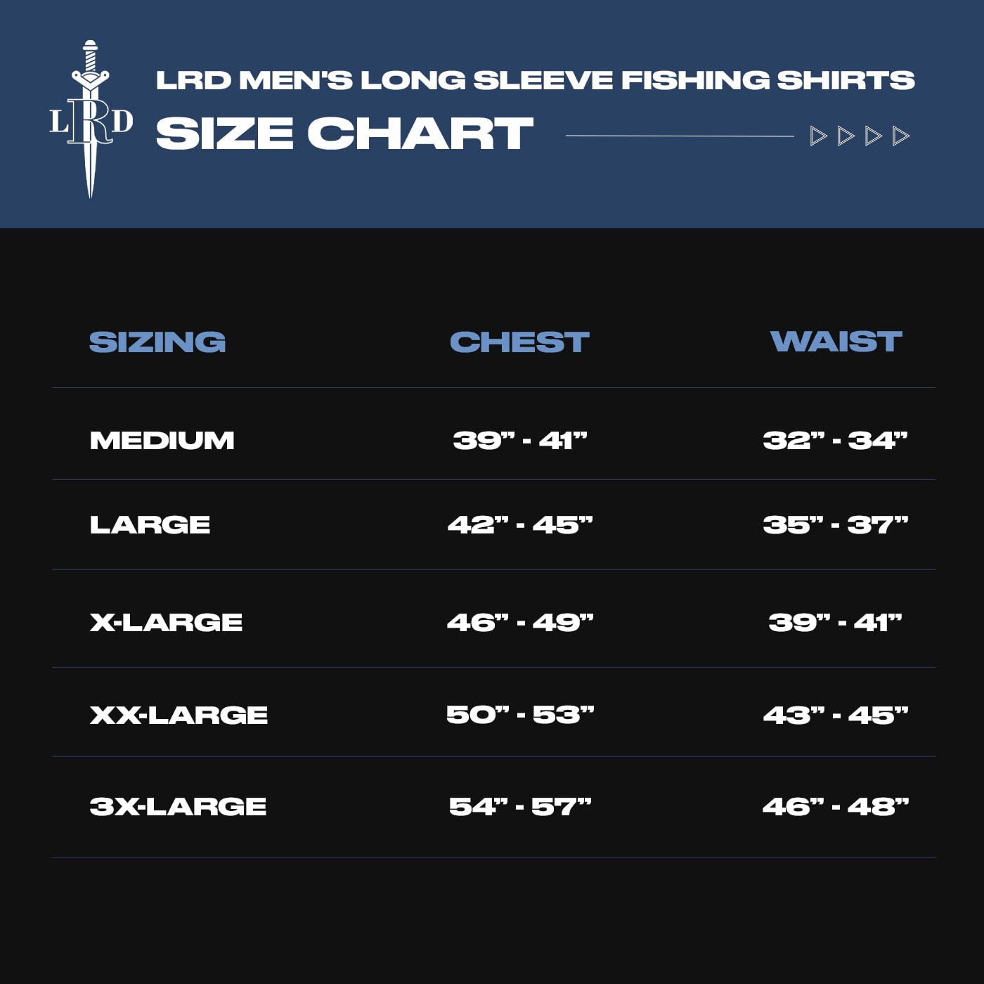 - Sizing: Fishing shirts for men have an ultra-light relaxed fit and are available in sizes M-3XL | Chest Size: Medium 39-41"; Large 42-45"; X-Large 46-49"; XX-Large 50-53"; 3X-Large 54-57"